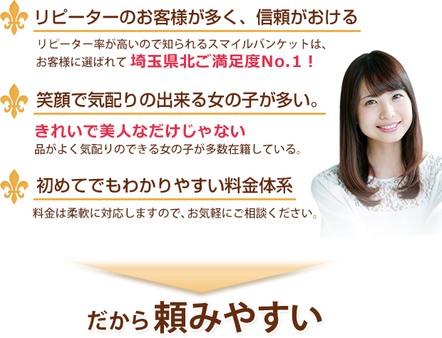 埼玉県熊谷市を中心にパーティー・宴会コンパニオンをご提供しております。 笑顔の似合う清楚で知的なスタッフ揃いですので、ぜひご用命いただければと思います。